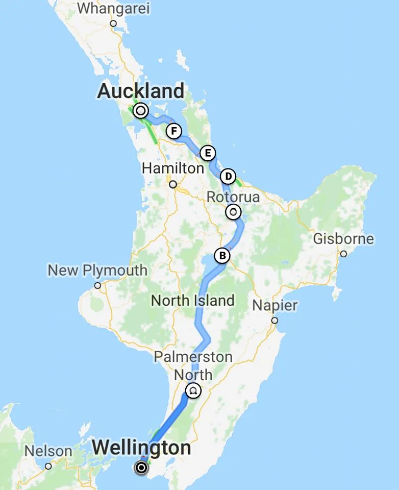 Route through the North Island, roughly 1000km.